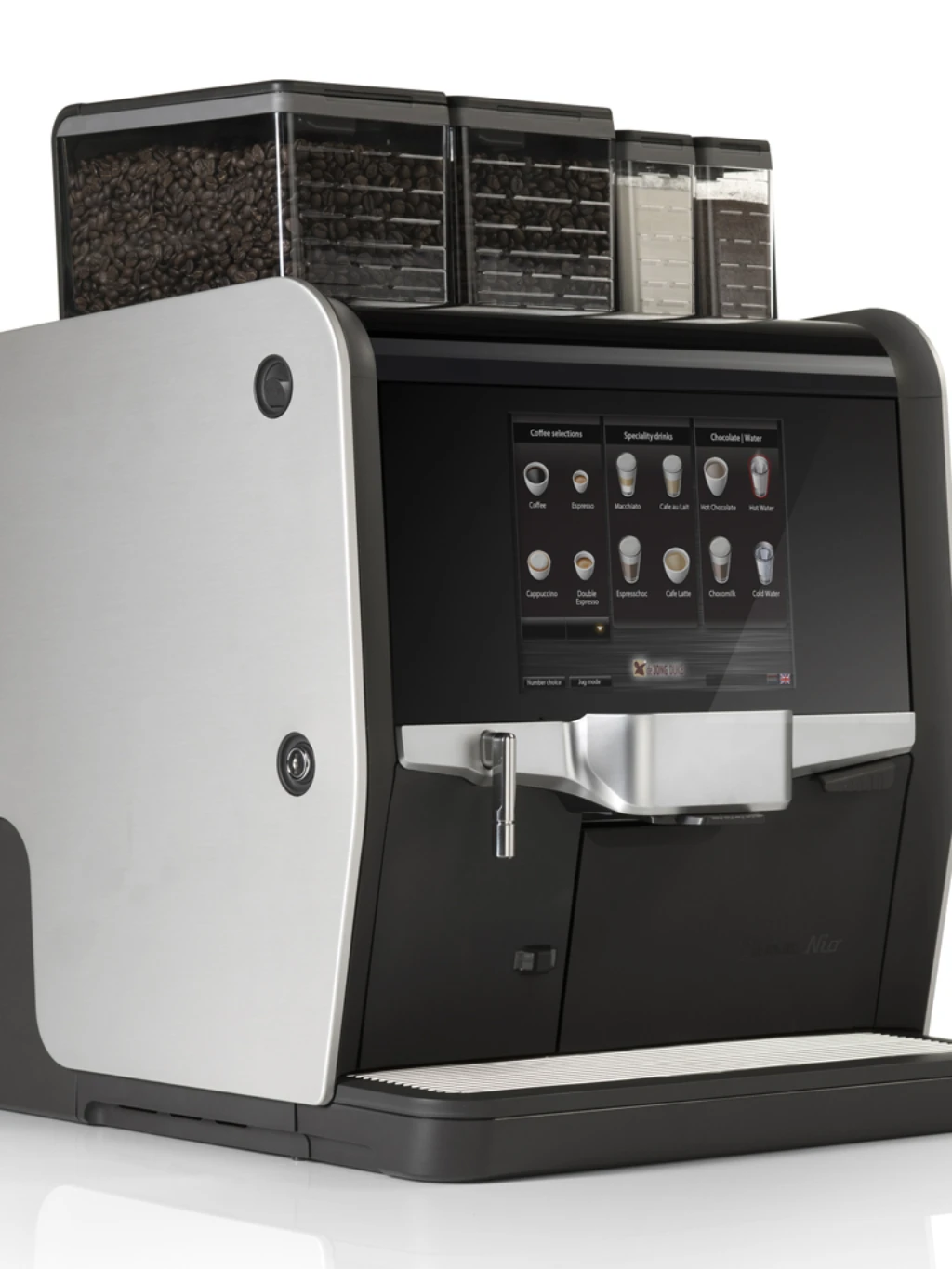 Maskinen har 4 ingrediensbeholdere; 2 til kaffebønner, 1 til chokolade og 1 til mælkepulver (også vegansk). Informationsdisplay 10,4” farve touchskærm, hvor det er muligt at tilføje dine egne screensavers.